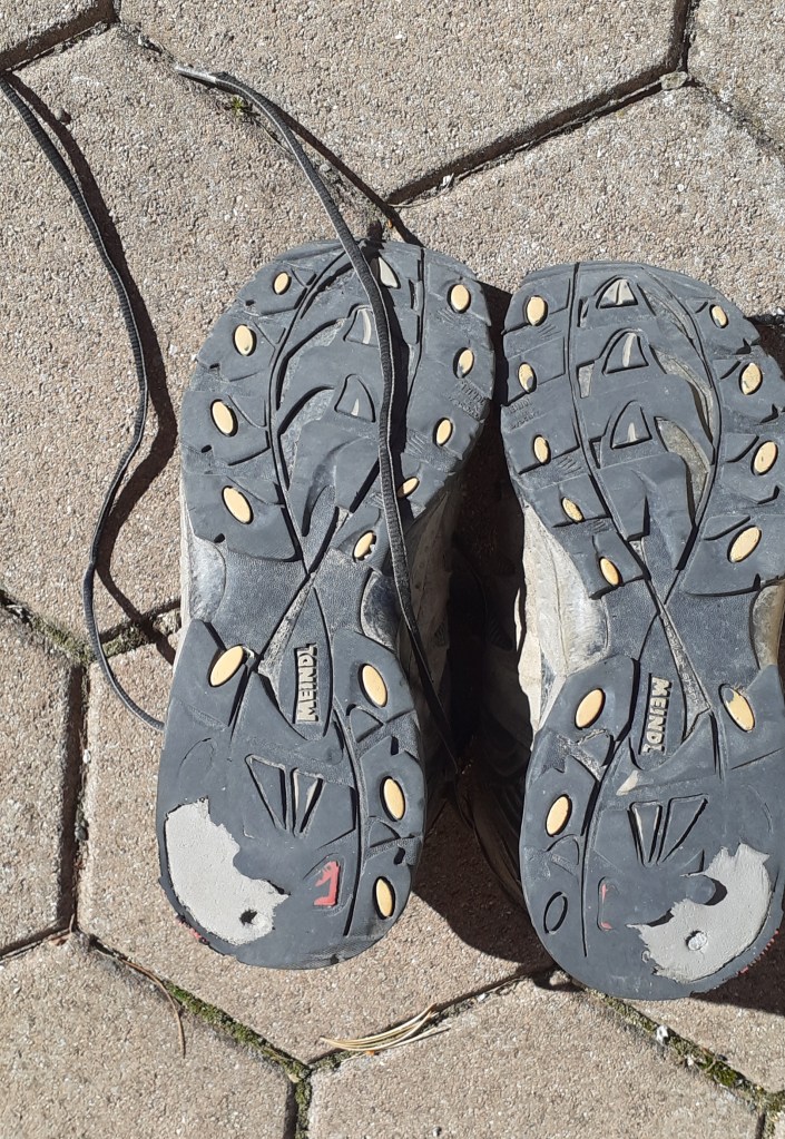 The Meindl Respond Mid GTX boots were pretty knackered by the end of the first stage of the walk from St Peter’s Winterbourne Stoke to Bourg St Pierre. Including practice walks I estimate I must have walked around 1,700 km in them.