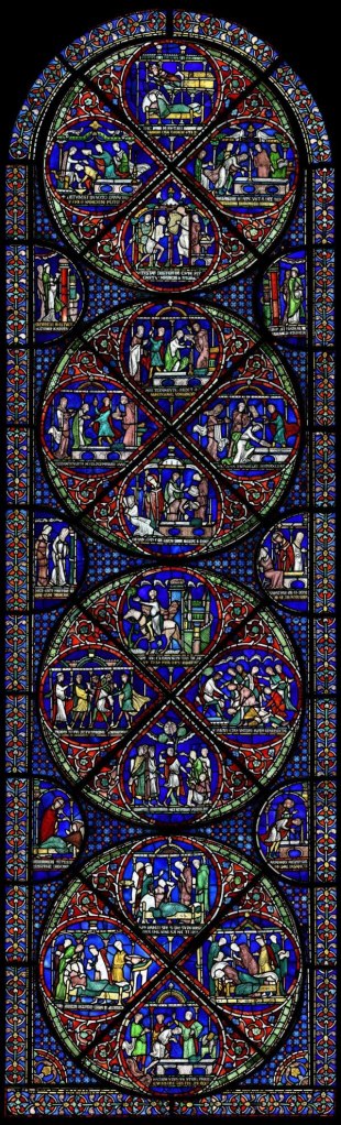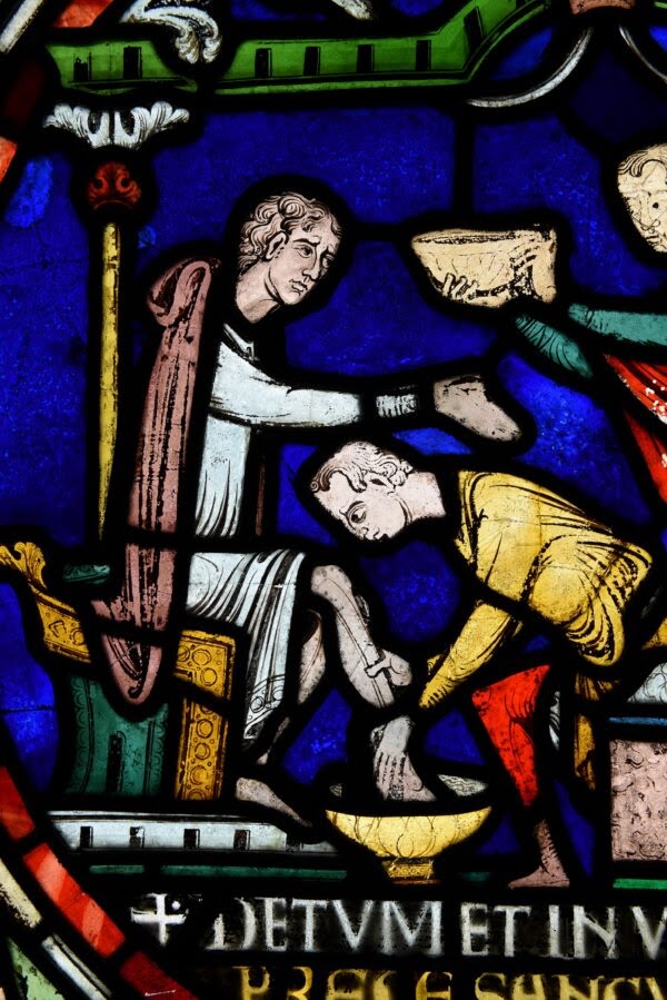 At the top of the 5th Miracle window, in the left-hand teardrop, Ralph de Longeville sits next to Becket’s tomb, where an attendant bathes his legs in St. Thomas’s Water, after which he is cured of leprosy.