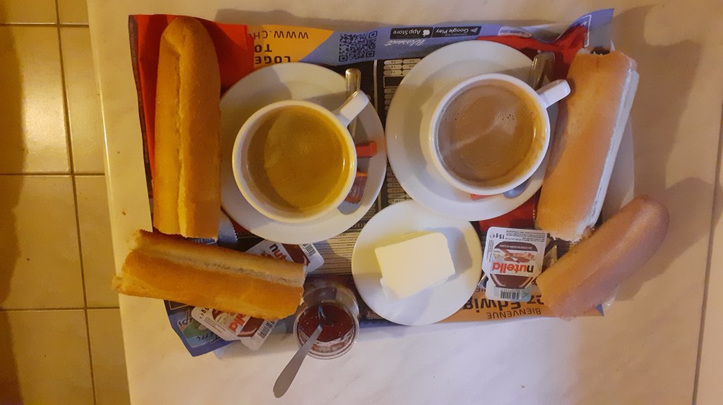 For some reason the propriétaire thought there were two people staying the night ( THERE WEREN’T!) and had provided petit dejeuner accordingly! I smiled sweetly and accepted the bounty without demurring – lunch of baguette and nutella/cheese was sorted.
