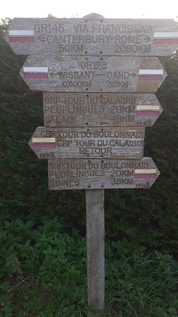 Leaving Wissant and the Côte d’Opale behind me, my route took me up the Mont de Couple, a 163m high vantage point over the surrounding countryside. The panoramic view from the summit was awe inspiring, tempered slightly by the sign which indicated that it was still 1,284 km (as the crow flies) to Rome and 610 km to Geneva!