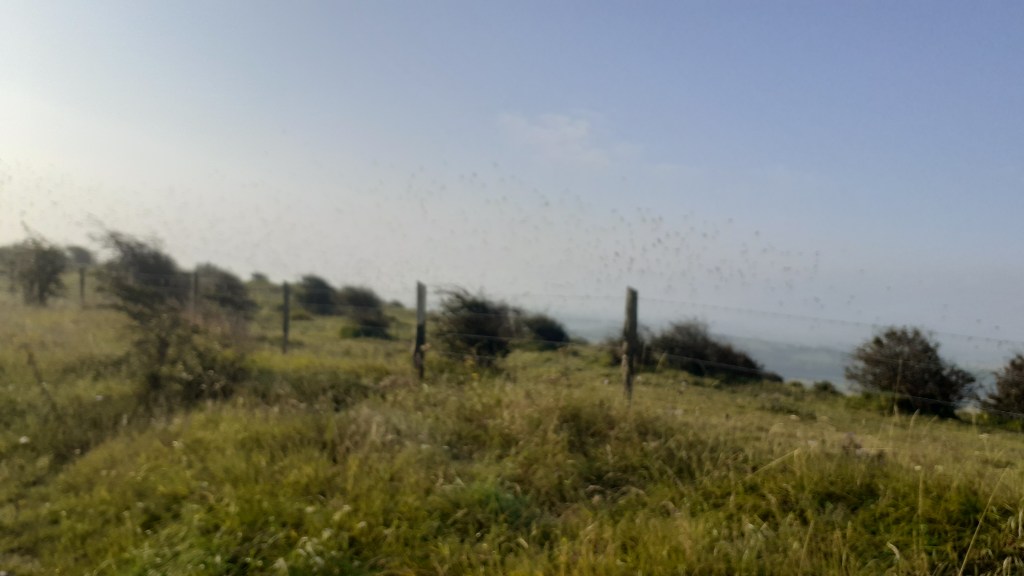 I lingered awhile on the summit, and as I did so, a murmuration of starlings suddenly appeared, circling and swooping around the slopes of the Mont de Couple in the fading morning mist.