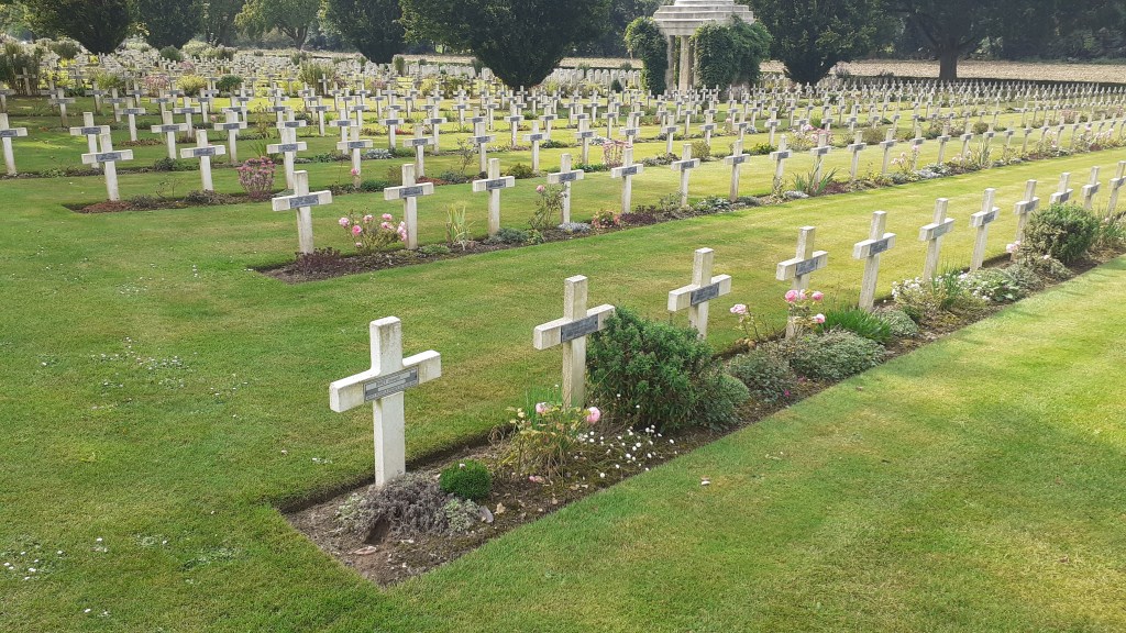 Heading out of Ecoivres I passed my first war cemetery. I wandered in and had a look around. In the middle there was a small stone wisteria covered structure which resembled a Greek oracle. Serrayed rows of head stones and memorial crosses stood on immaculately maintained plots and manicured grass.