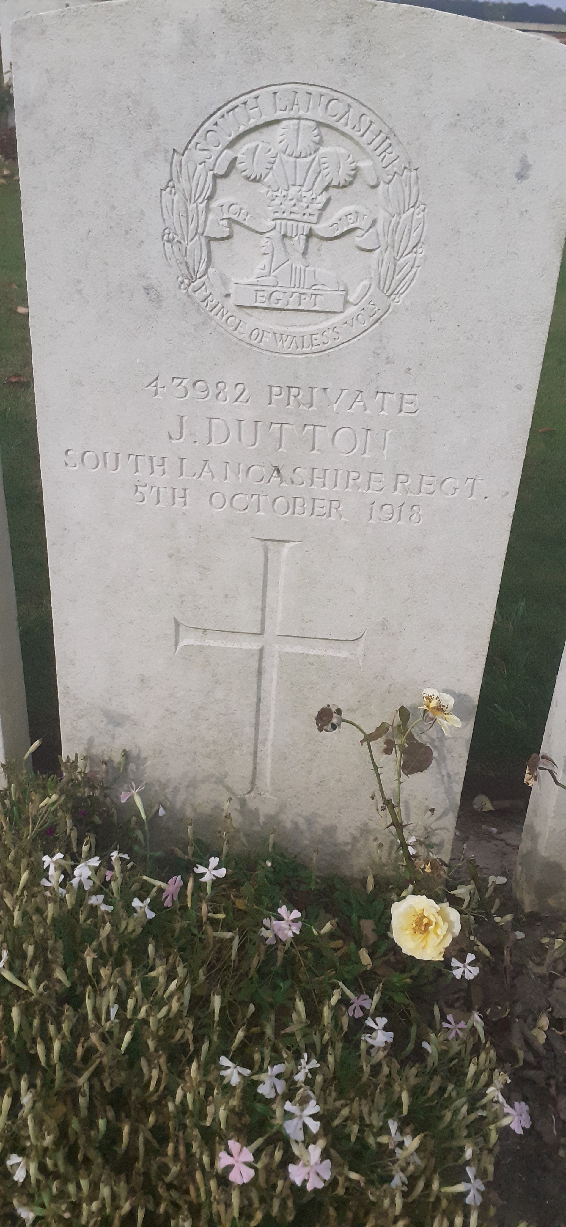 As I headed south to Bapaume I passed a British cemetery and made the decision to try and look at the headstone of every British soldier I passed today. The second cemetery I passed was called ‘The Sunken Road Cemetery. As I walked down the rows of headstones I suddenly did a double take and stopped dead in my tracks. Had I just seen my name on a headstone? Yes, I had! J.Dutton of the South Lancashire Regiment – killed on the 5th October 1918, just a month before the end of the war. The headstone didn’t give his age, but the way coincidences were stacking up on the walk I would have put money on his having been born on 7 November!