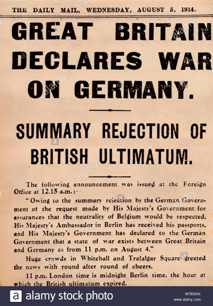 On the 4th August 1914, Germany invaded Belgium. Britain was allied to Belgium and sent an ultimatum that Germany should immediately withdraw its forces. When no reply was received, Britain declared war on Germany at midnight on the 4/5thAugust 1914. The German invasion of ‘Plucky Little Belgium’ was thus the ‘casus belli’ which triggered Britain’s declaration of war and the start of a conflict that over the course of the next four years would cost the lives of nearly a million soldiers from Britain and its colonies.