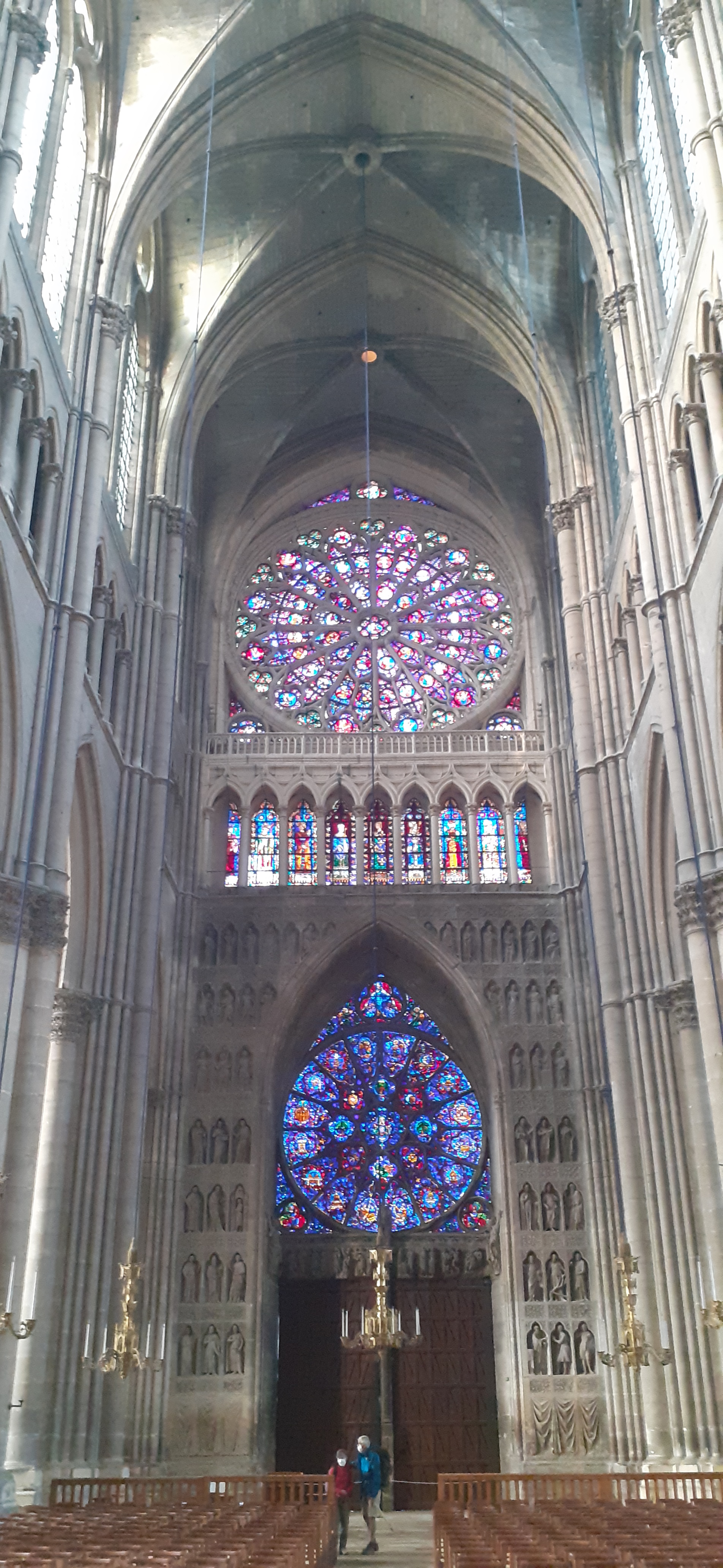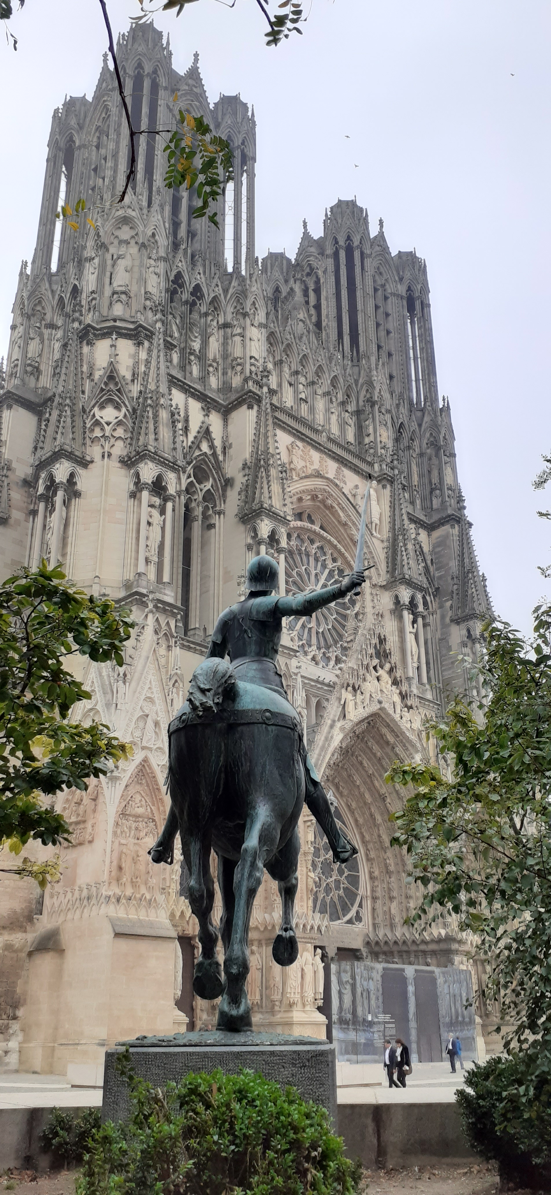 The day got off to an excellent start. As I was mulling over the 2 hour walk into Reims, a miracle occurred. Without warning a bus appeared outside the abbey doors with the sign ‘ Reims Tram station’ on it’s front. Not one to look a gift horse in the mouth, £ hopped on board. Twenty minutes later after a nifty switch to the tram and I was standing outside the front of Reims Cathedral. Manna from heaven.
