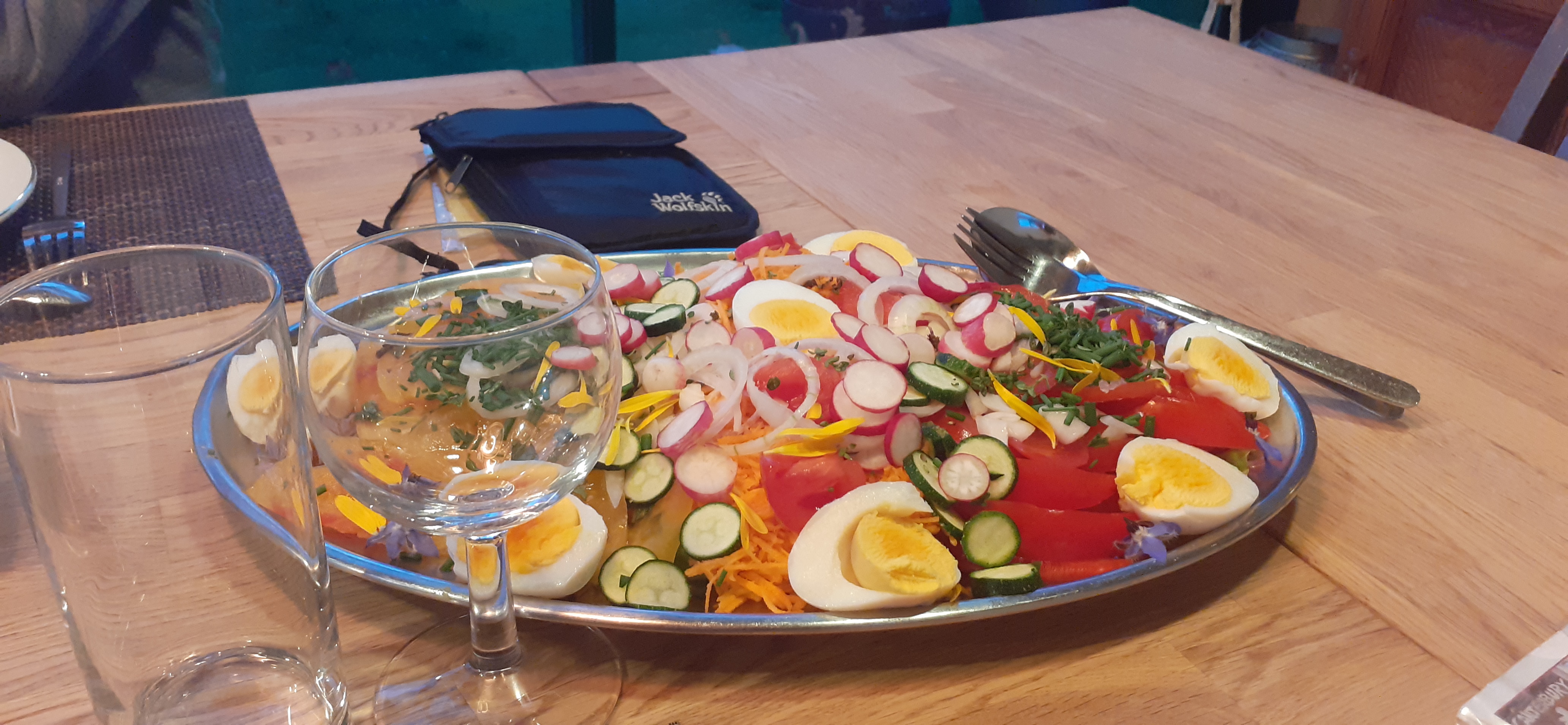 Dany and Dominique, the proprietaires of ‘La Cressonière’ provided us with a sumptuous supper which began with a delicious salad, progressed to a hearty spaghetti bolognese, moved on to a selection of cheeses and finished with a mouth watering creme brulée made with duck eggs.