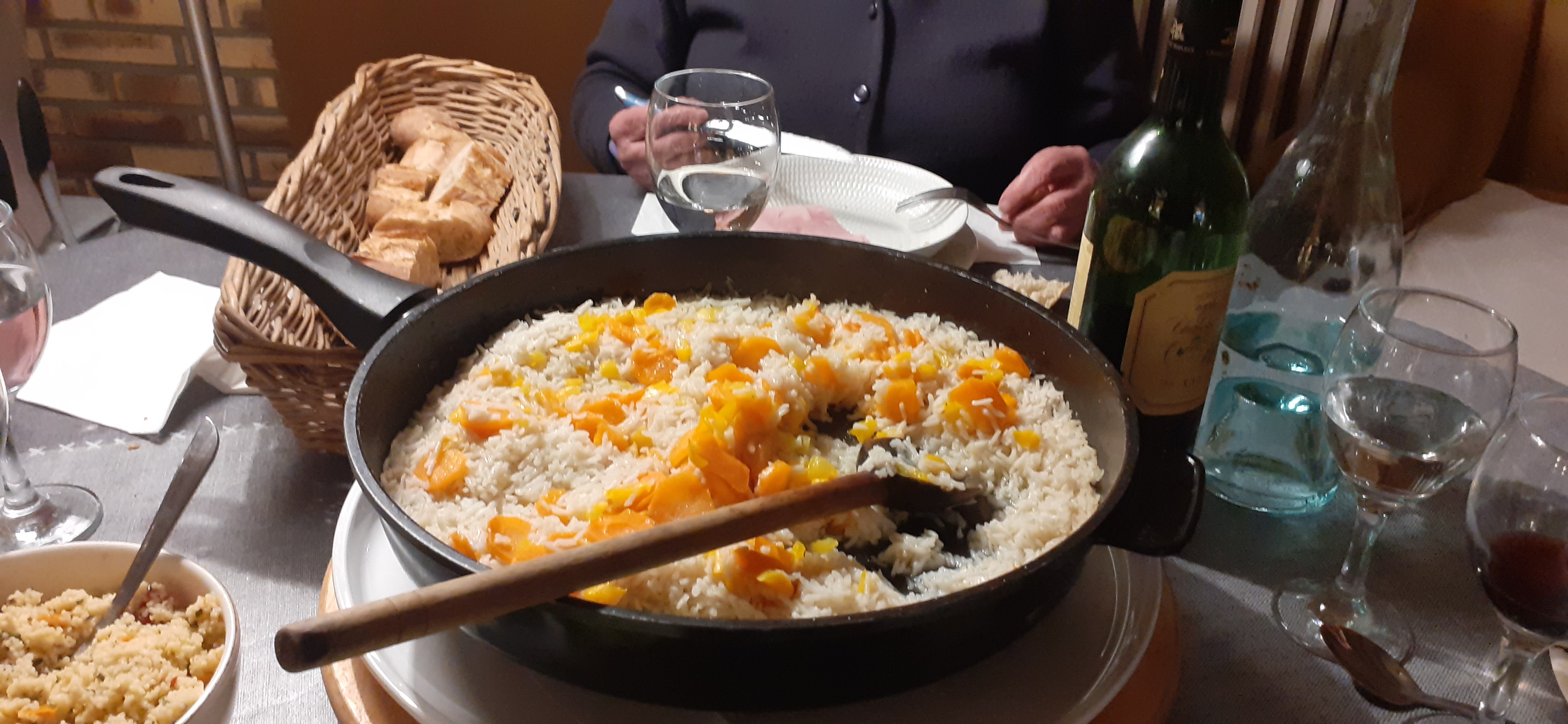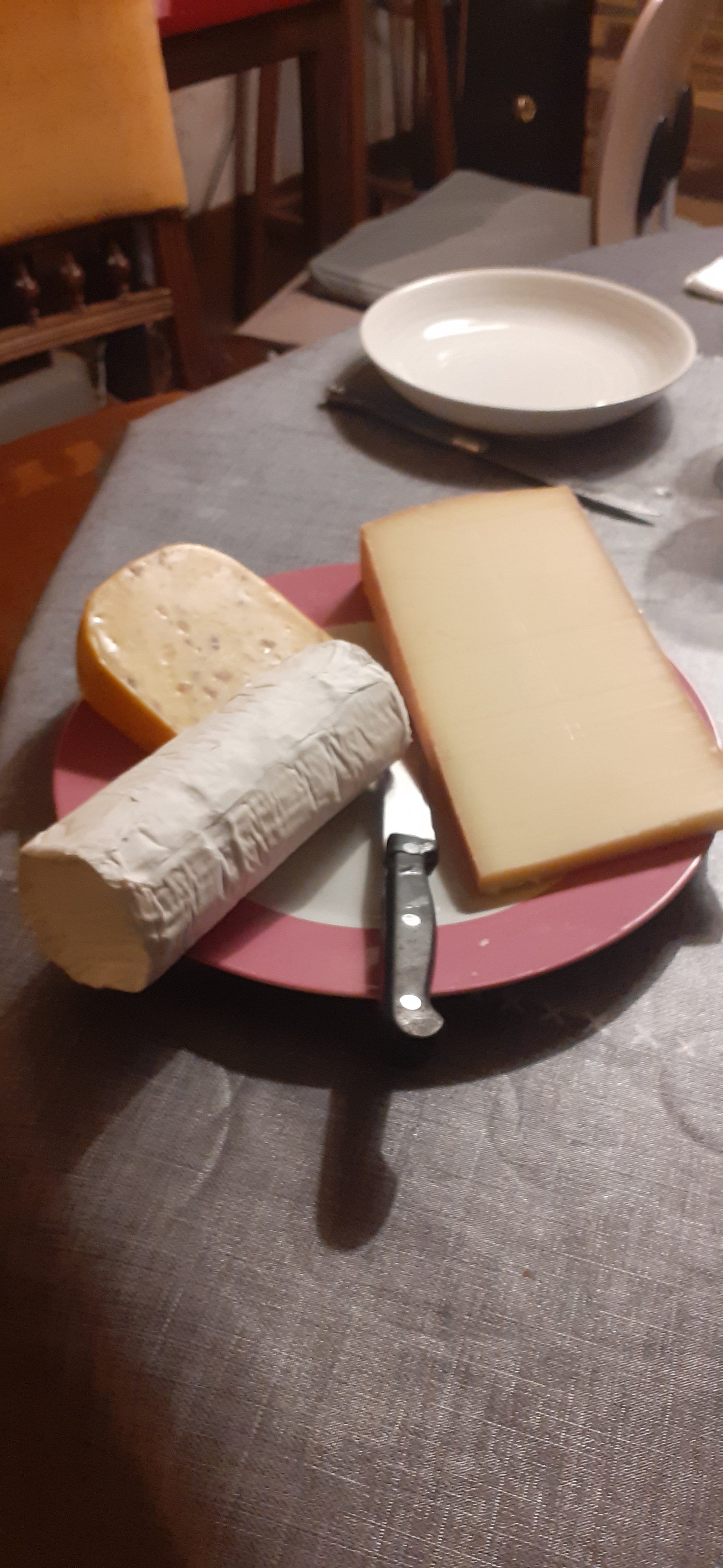Claudine’s mother, Francine, enjoys having pilgrims to stay apparently, as suppers become more extensive. So it proved last night. We began with soup, moved on to salmon and herring. Then came a prawn paella, followed by cheese ( including of course regional Comté).