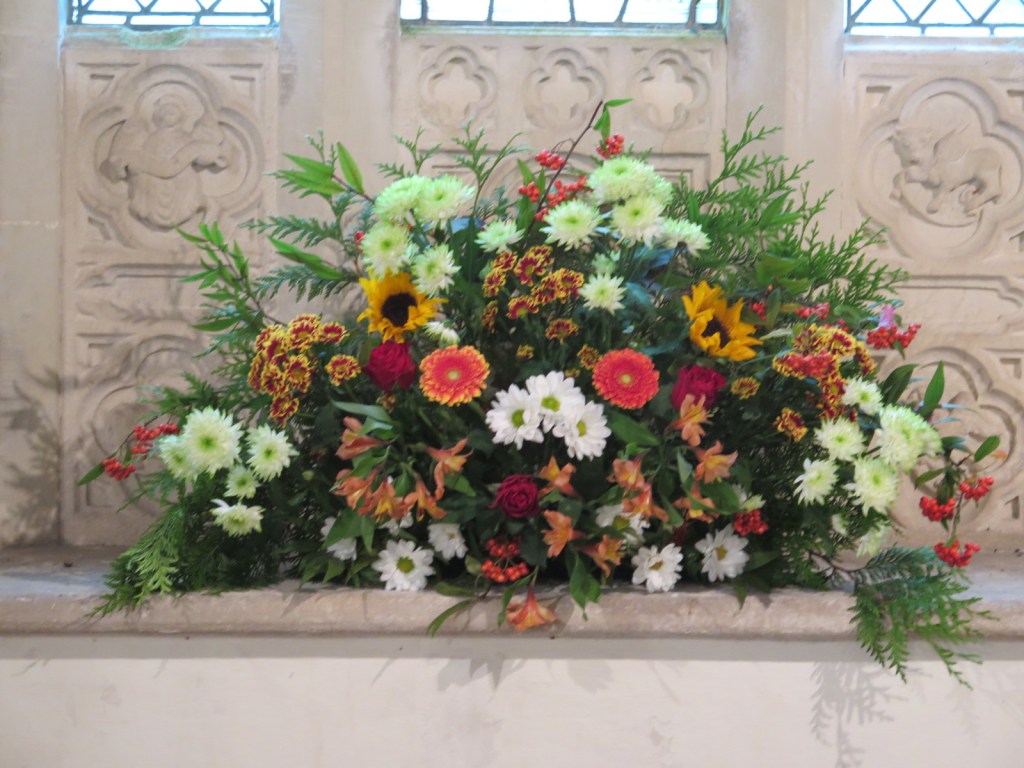 The church looked beautiful with an array of autumnal flower arrangements and flickering candles.