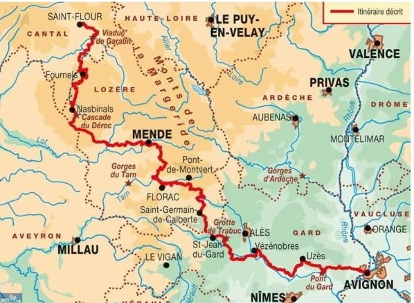 The 428km path runs from Saint Flour to Avignon, crossing the Aubrac. Mount Lozere, the Tarn gorges and the roam acqueduct at Pont du Gard before reaching Avignon.