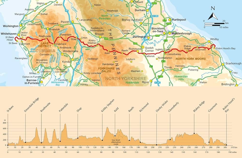 The varied landscapes that you encounter on this journey are truly epic, from windswept crags and fells of the Lake District to the upland tarns and waterfalls of the moors and dales and of course Sea cliffs at St Bees. The walk meanders 317km/192 miles from St Bees in Cumbria to Robin Hood’s Bay near Whitby, traversing the Lake District, the Yorkshire Dales, the North York Moors and all manner of peaty bogs, rock-strewn hills, rivers, quarries, meadows, trails, tracks, farms and derelict mines along the way. There is variety on this iconic walk with each of the three national parks you cross en route offering contrasting landscapes. The Lake District is filled with lakes, streams, and waterfalls. The Yorkshire Dales is full of rolling green hills. And the North York Moors are an expanse of heather-filled moorland. What’s not to like? One just needs the weather to co-operate….