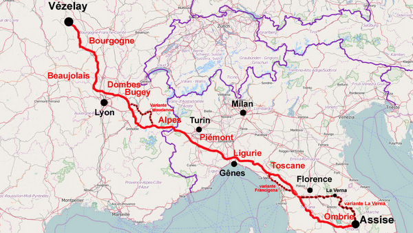 Not to be confused with the Way of St Francis which runs 550km between Florence and Rome in the footsteps of St Francis of Assisi, the Way of Assisi runs 1,500km from Vezelay to Assisi. The walk passes through Morvan, Beaujolais, Dombes and the valley of Maurienne before crossing the Alps into Italy via the Mount Cenis Pass. It then passes through Piedmont, Lombardy to the heights of La Spezia before crossing Tuscany and Umbria and reaching Assisi. Around 650km of the walk is in France and 850km in Italy.