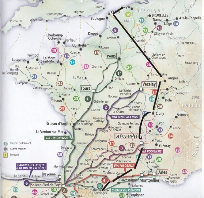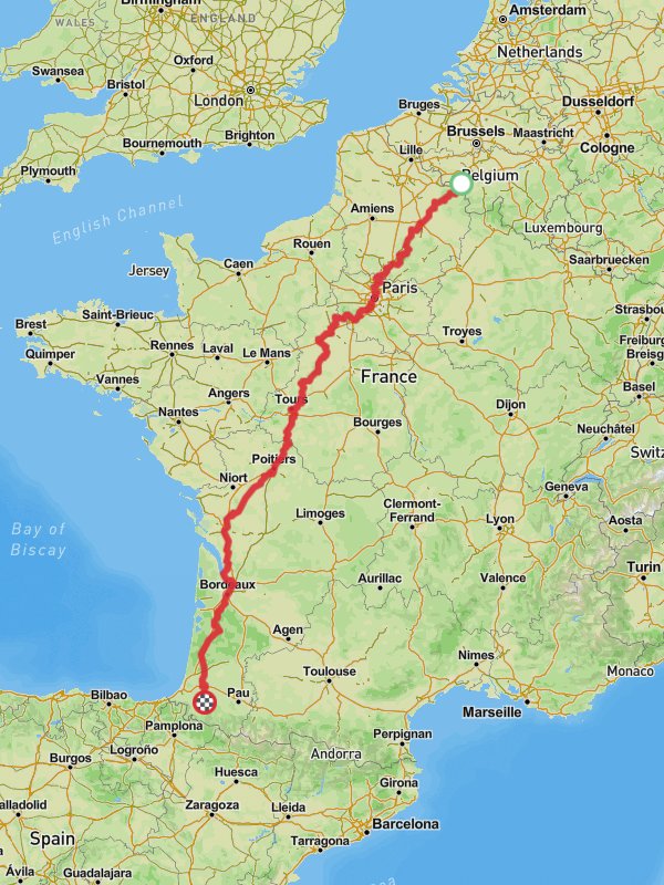 The path stretches 1,500km from Brussels to the Pyrenees passing through Paris from where is goes to Orléans,then follows the Loire valley to Tours where it joins the route from Chartres; it then goes southwest through Poitou and the Saintonge to Bordeaux; and finally passes through les Landes to join the routes from Le Puy and Vézelay at Gibraltar just beyond Saint-Palais. The medieval route would have been along Roman roads and the main towns were all major Roman towns at important cross-roads, many already major pilgrimage centres in their own right.