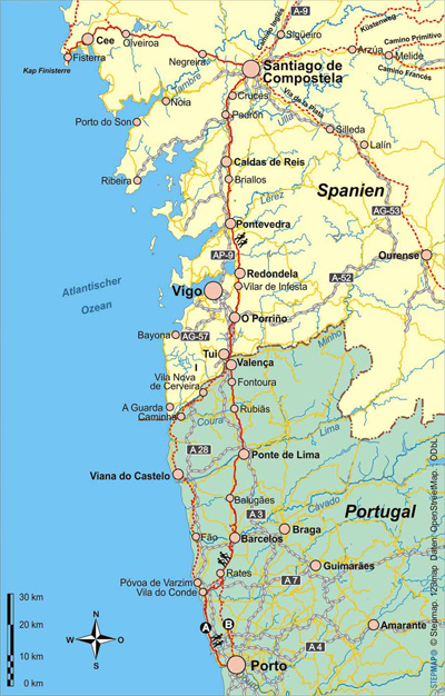 The Camino Portugués, or Portuguese Camino, is a pilgrim route which offers a scenic, rural alternative to the much busier Camino Frances. Portuguese pilgrims have been making the journey to Santiago since the mid-12th century. You can start the Portuguese Camino in either Lisbon or Porto. The latter is an increasingly popular option thanks to its shorter length – 260km from the starting point near Porto, compared to 628 km from Lisbon. From Porto, there are two options to walk to Santiago: the Caminho da Coasta (Coastal Way) or the Caminho Central (Central Way, or Inland Path).