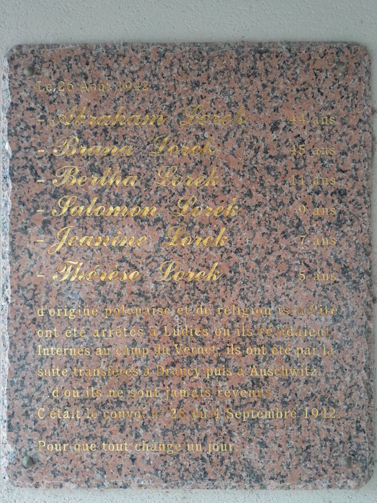The rain continued to lash down as I made my way through fields to the little village of Ludiès. Taking shelter from the rain in a little covered alcove commemorating the village’s war dead, I noticed a marble plaque on the wall behind me. It commemorated the Loreks, a Jewish couple and their four young children aged three to nine. Originally from Poland, they were seized on 26 August 1942 and transported to Auschwitz, whence none of them returned.