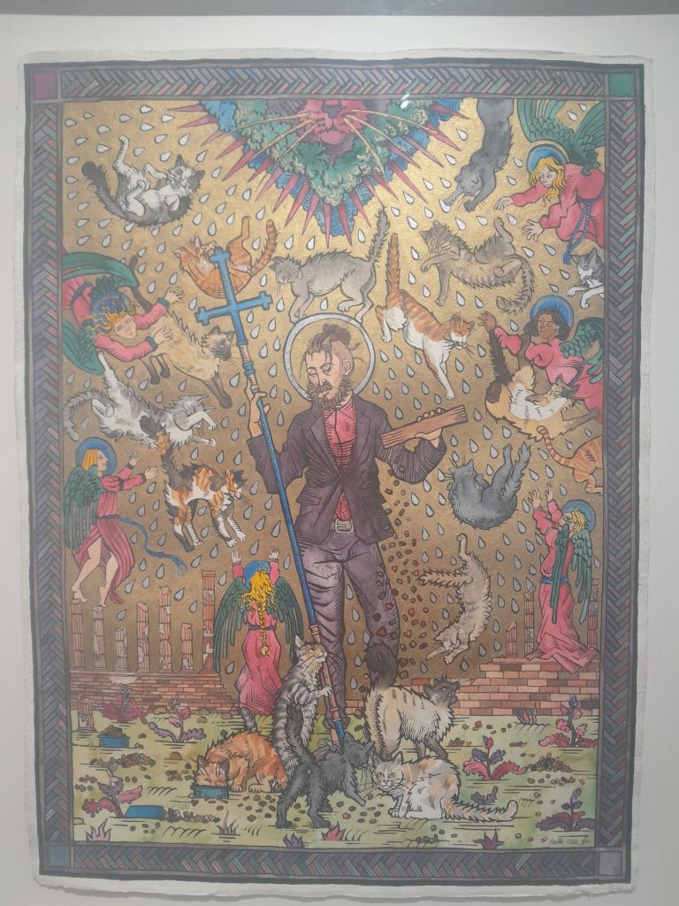 I looked around the exhibition of mediaeval art, most of which was fairly bizarre. Reinterpretations of mediaeval illustrated psalters included a painting of a man in a suit being bombarded with falling cats! Only in France!