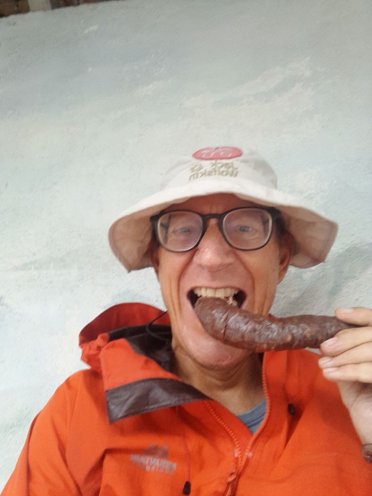 Shortly before Bagnères de Bigorre, I again took refuge from the rain in a bus shelter and polished off the sausage. I needed something to lift my spirits as the rain continurf to teem down.