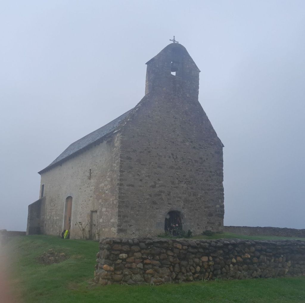 Later during the morning I stumbled across the isolated chapel of Notre Dame de Roumé on the road to Bagnères de Bigorre. Built in thr 12th century on the pilgrim route to Compostella, it must be quite a sight on a sunny day with the Pyrenees in the distance. Despite the dreich weather, I took the opportunity to shelter from the rain and dig into the ham and sausage I’d bought the previous day in Arès.